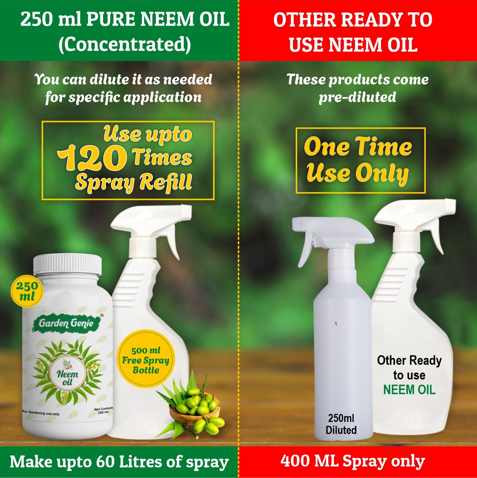 Garden Genie Pure Organic Cold Pressed Water Soluble Neem Oil for Plants with Sprayer | 250ml Concentrate Makes up to 60 Liters of Ready to Use Neem Oil Spray