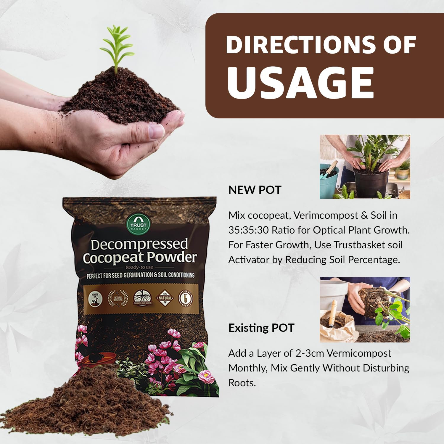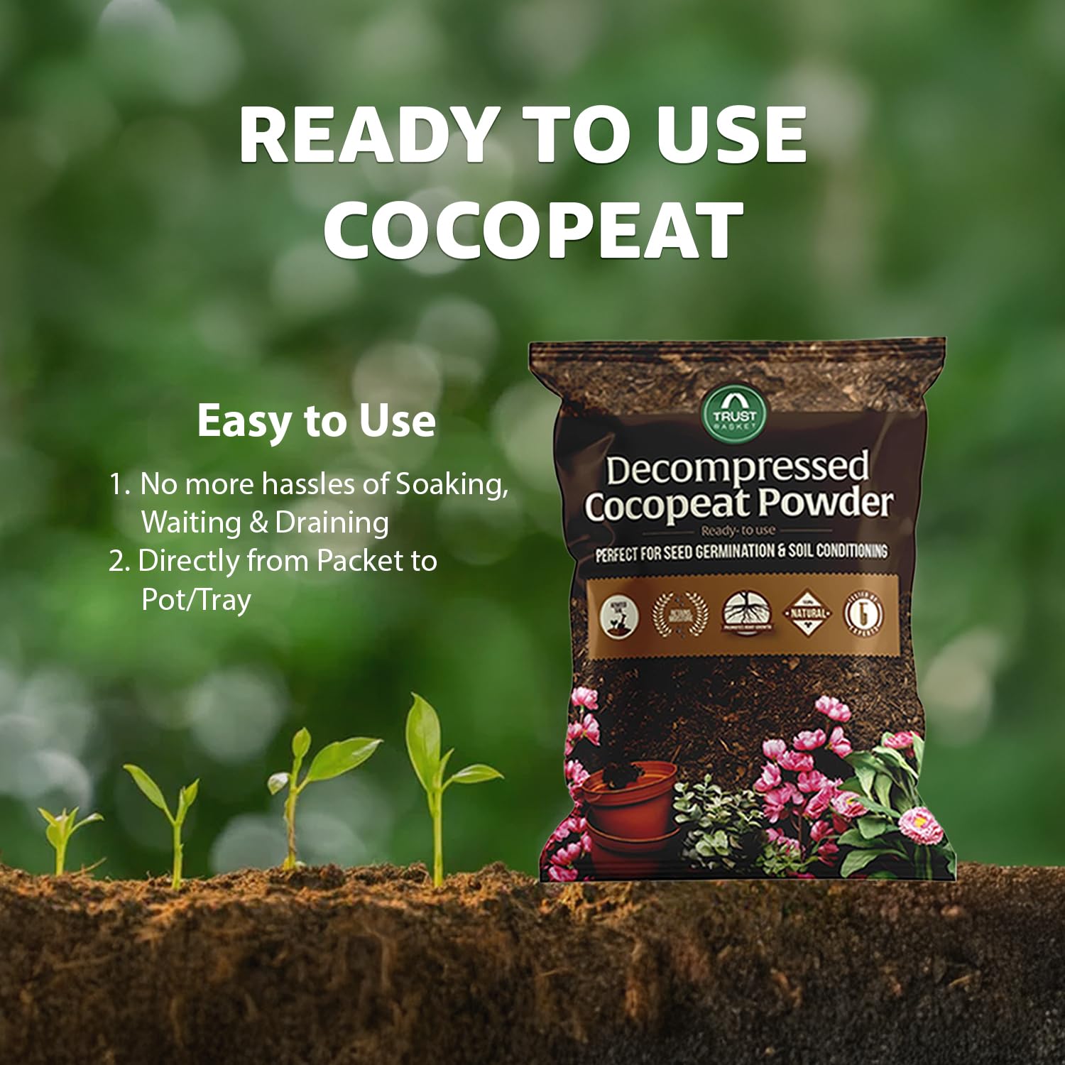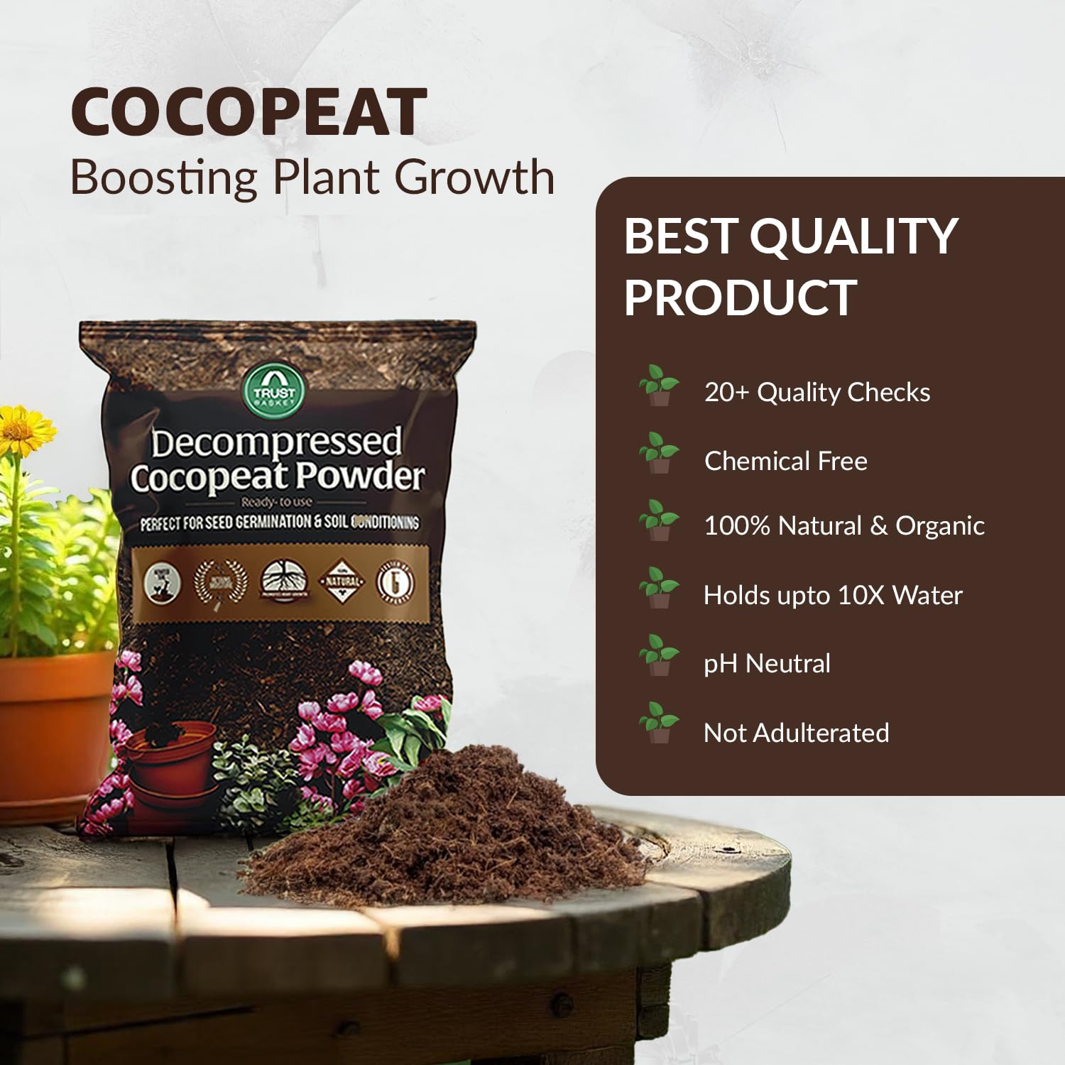 - Versatile Growing Medium: TrustBasket cocopeat powder can be used in pots, hanging baskets, garden beds or hydroponic systems. Mix it with soil or compost to enrich outdoor flower beds and vegetable patches, or use it alone in propagation trays and vertical gardens. Its fine texture makes it a great additive for container gardening and indoor plants, providing lightness and structure to heavy potting soils. Eco-conscious gardeners also use cocopeat in worm compost bins and seed bombs, demonstrating its versatility across all planting methods.